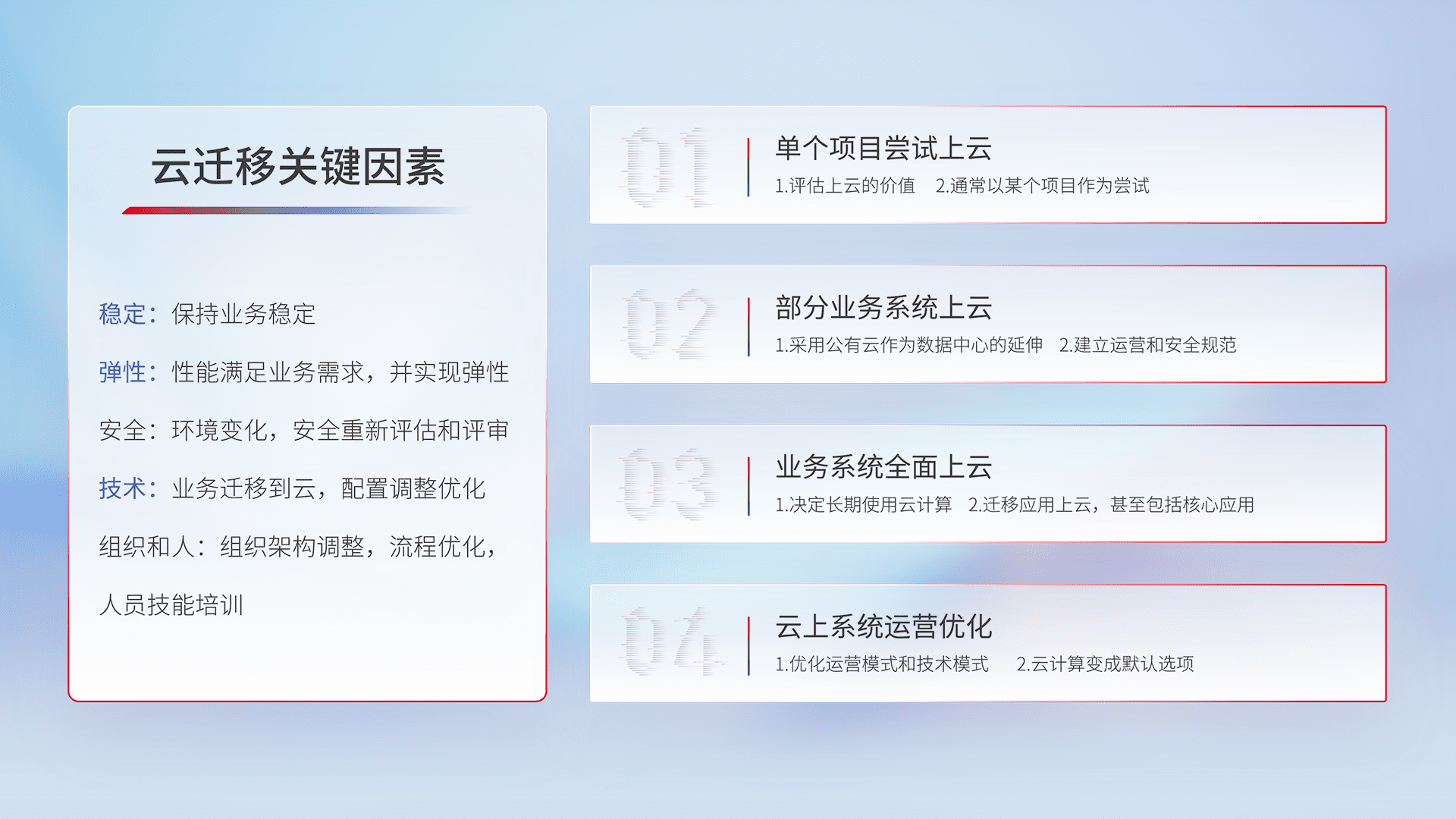 结合实际业务,,从规划设计、、、、云平台选型、、、云原生改造、、、数据迁移、、、集成交付,,,迁移全过程为客户识别最佳上云路径,,做好风险识别管理,,,设计网络架构、、、身份权限、、、、安全审计合规、、操作审计、、、日志审计、、、、监控告警策略、、、多站点容灾设计等,,,,对云上基础设施进行整体规划,,,提升IT治理水平,,,,以满足弹性、、、高可用、、、高性能的需求。。。。