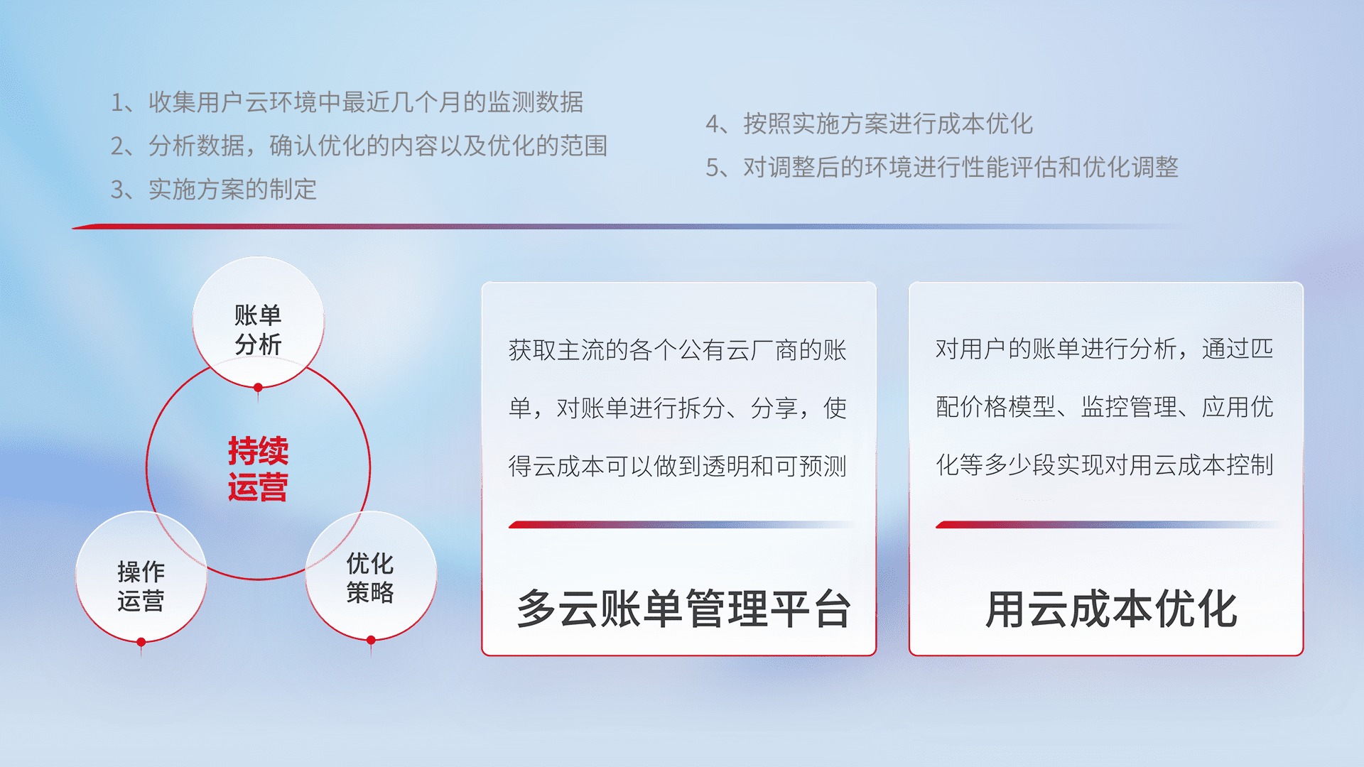 通过多云纳管,,,以统一的资源数据模型把客户的云资源进行抽象和封装,,,,进而实现对多云资源的统一操作,,,保障云资源管理的可靠性、、、、稳定性与可用性。。。。量身定制化运维内容,,,,配置、、、开发运维、、补丁管理、、备份、、监控、、、、认证和访问管理、、审计和日常巡检等,,,保障在用云过程中的可靠度,,,稳定度以及高可用率。。。。