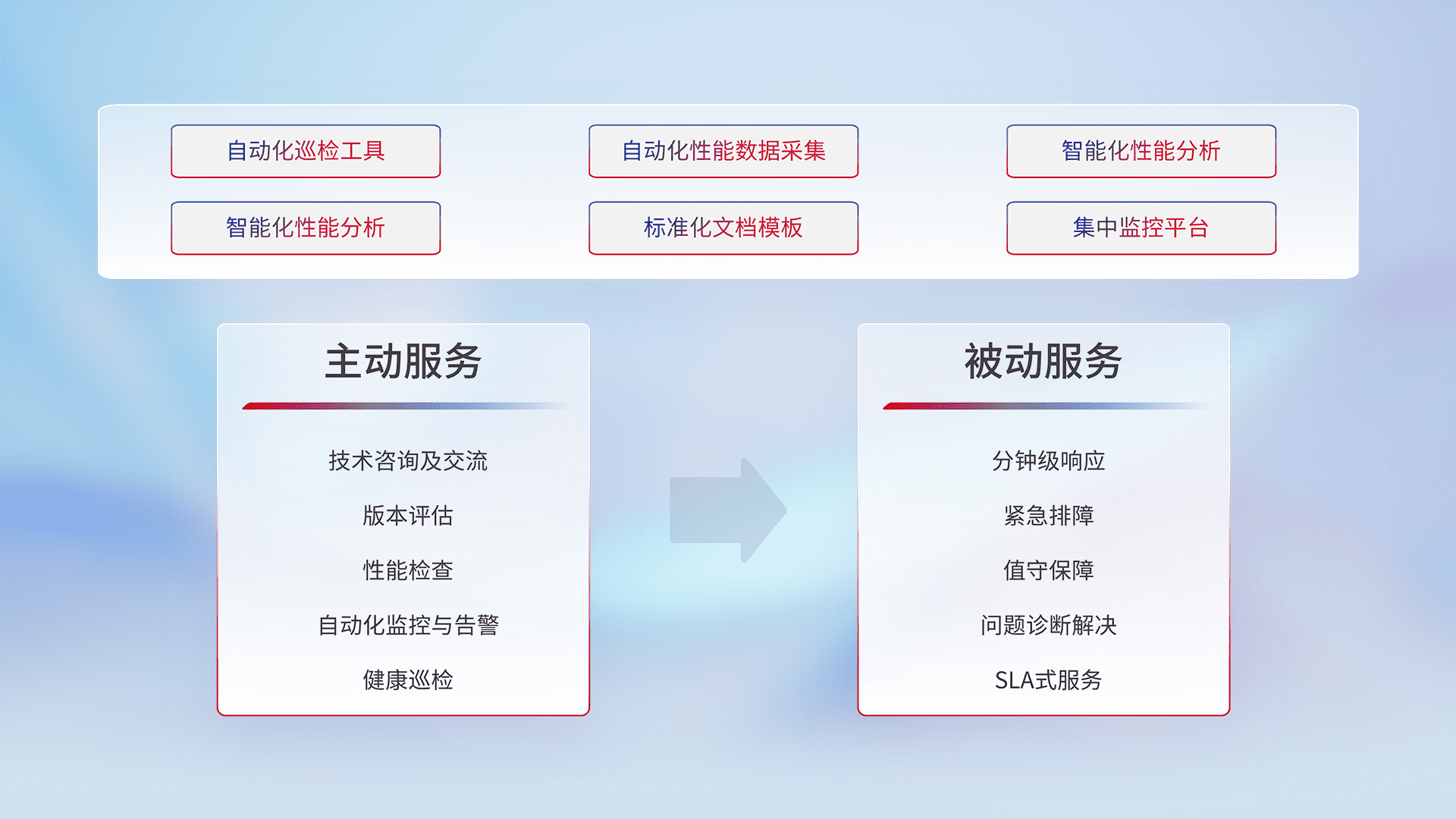 智能化工具和标准化文档,,保障服务质量,,提供主动服务(包含技术咨询、、、版本评估、、性能检查、、、、自动化监控与告警、、、、健康巡检)和被动服务包含(分钟级响应、、紧急排障、、、值守保障、、、、问题诊断解决、、、、SLA服务)。。。。