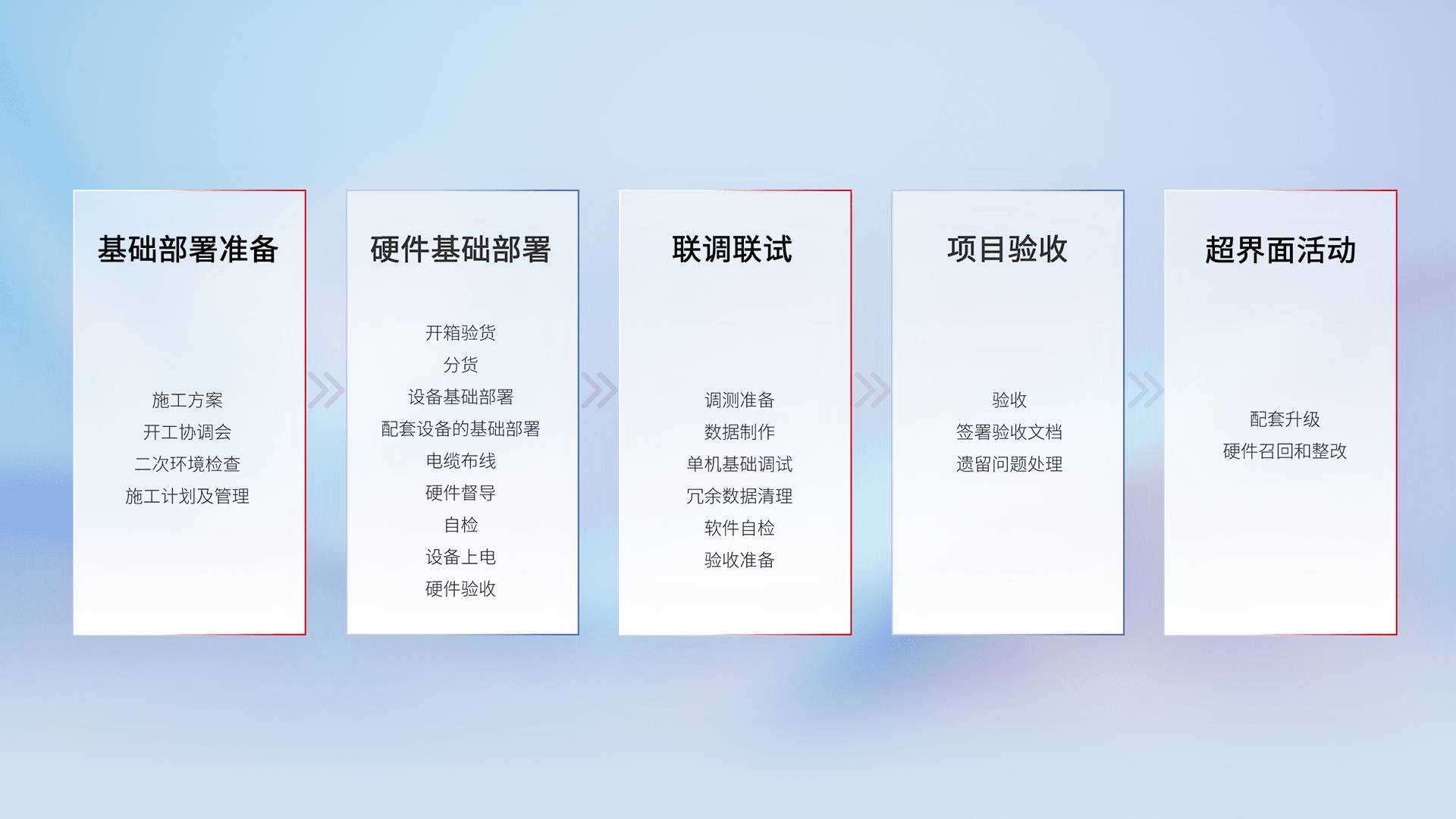 从基础部署准备、、、、硬件基础部署、、联调联试、、项目验收、、、、越界面活动的全过程可追溯,,保证施工质量和进度。。。。